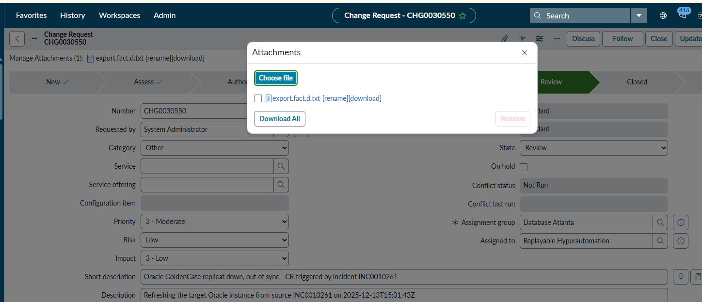 I am using the Ansible ServiceNow ITSM. Essentially, it is a Python-based automation software that extends the capabilities of ServiceNow. The playbook I am using is supposed to do Oracle GoldenGate work (which works fine), then it is suppose to close the auto-opened and executed Change Request that triggered the work and attach the work log to the CR.