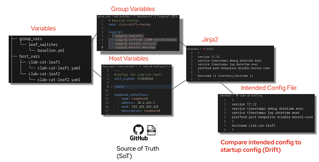 SSOT: The network single source of truth is established by defining variables for both group_vars and host_vars. These variables are iterated through a jinja2 template to render a complete cisco switch CLI configuration file. Please see the below git repo link for more details on how we created the intended configuration file.